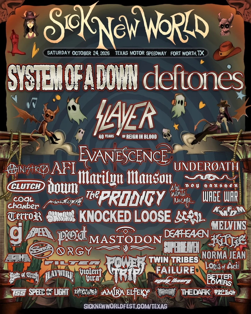 The inaugural Fort Worth edition, set for October 24th, 2026, at the Texas Motor Speedway, features System of a Down, Deftones, Slayer (celebrating the 40th anniversary of Reign in Blood), Evanescence, Ministry, AFI, Mastodon, Knocked Loose, Power Trip, The Prodigy, Underoath, Clutch, Down, Melvins, and more.