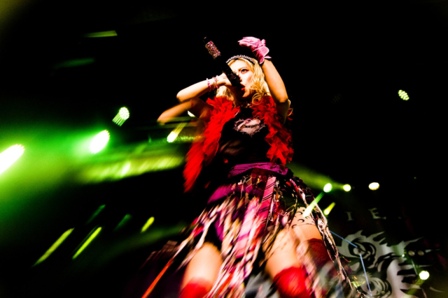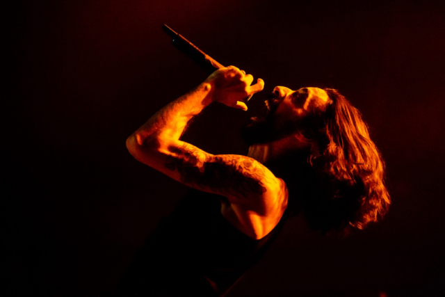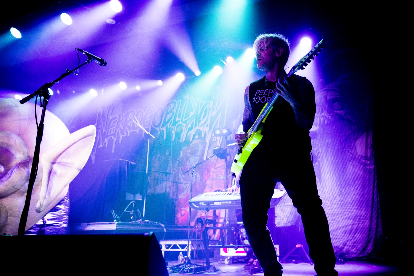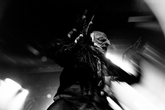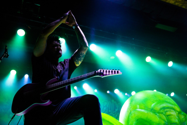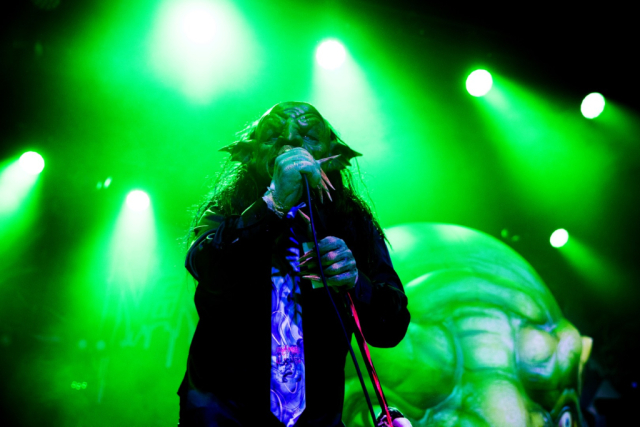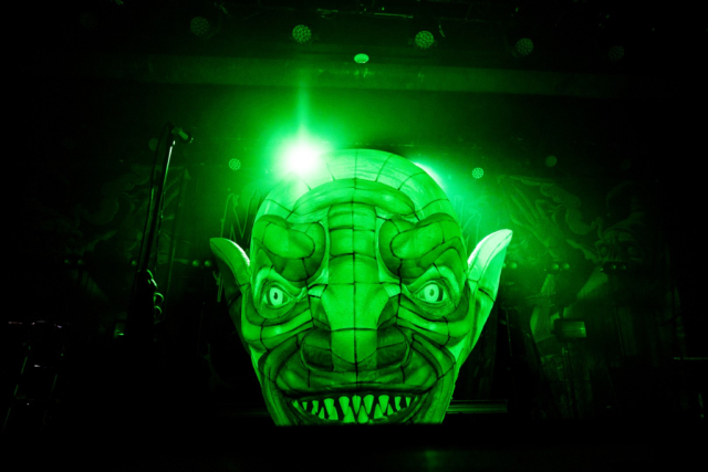 Nekrogoblikon starts their set with the Pokémon theme song leading them in, as a large blow-up goblin head stares down the audience. For a few minutes the venue is filled with fans singing along as the song slowly fades and the members of the band take the stage; the singing turns to cheers. As they begin their first song of the evening, John Goblikon walks out and the venue fills with a cheer of excitement then the chaos starts. Piercing the crowd with high-pitch squeals, deep screams and a comedic improv goblin walking around on stage hyping the crowd provided for a different but complimentary performance for the evening.