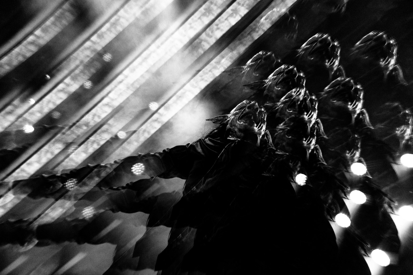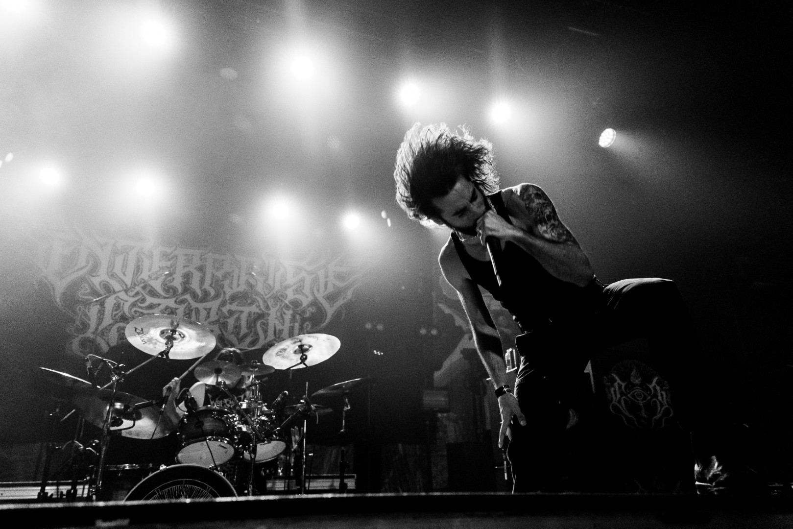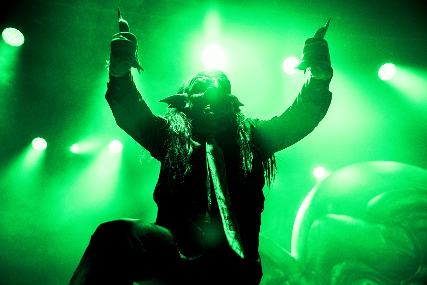 Nekrogoblikon starts their set with the Pokémon theme song leading them in, as a large blow-up goblin head stares down the audience. For a few minutes the venue is filled with fans singing along as the song slowly fades and the members of the band take the stage; the singing turns to cheers. As they begin their first song of the evening, John Goblikon walks out and the venue fills with a cheer of excitement then the chaos starts. Piercing the crowd with high-pitch squeals, deep screams and a comedic improv goblin walking around on stage hyping the crowd provided for a different but complimentary performance for the evening.